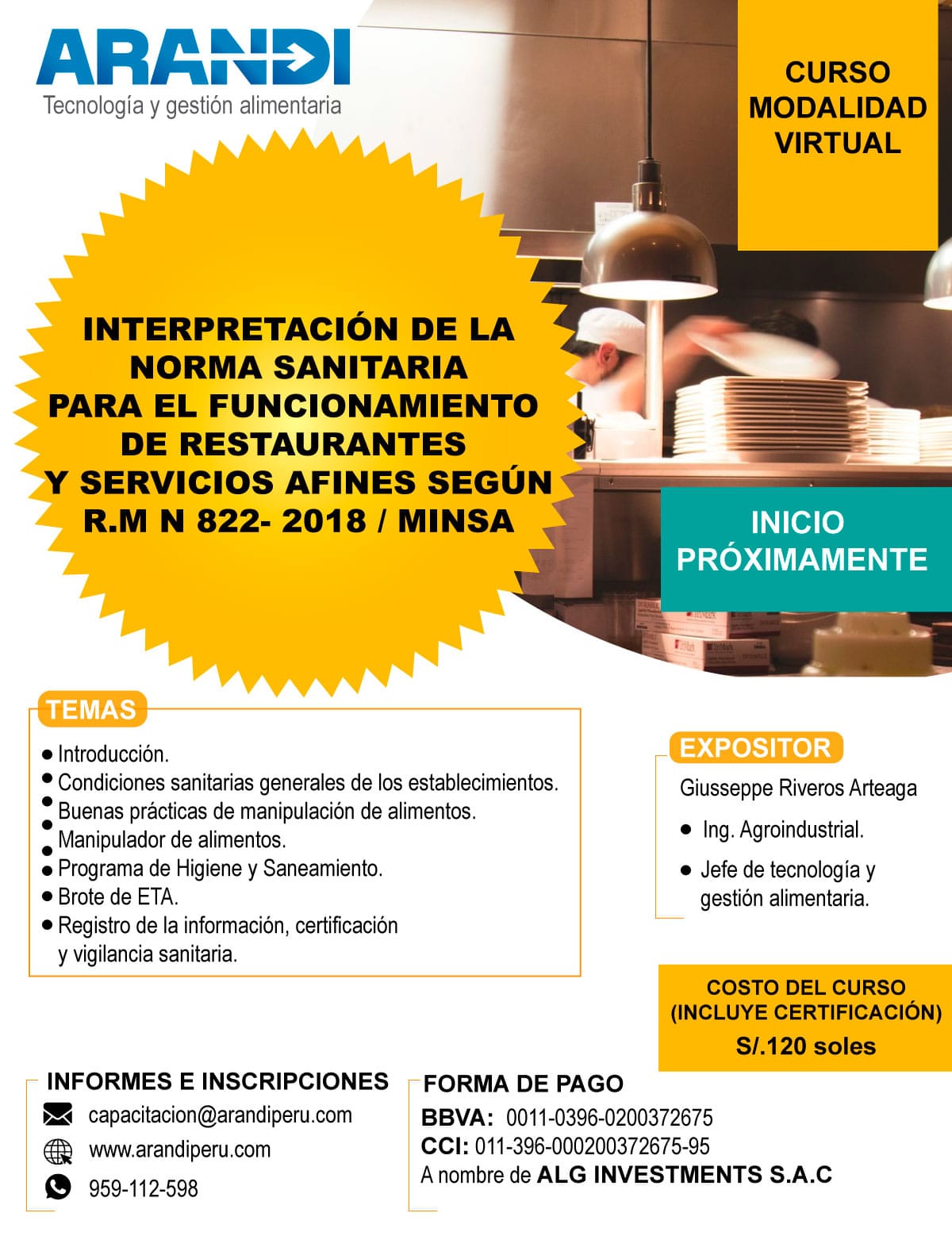 | -Interpretar y conocer los lineamientos de la Norma Sanitaria para el funcionamiento de Restaurantes y Servicios Afines, según R.M Nº 822-2018/MINSA |